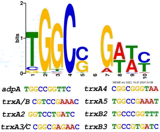 We previously reported that RSS releases the transcriptional self-inhibition on AdpA expression, thereby increasing AdpA levels [33]. We suspected that over-expressed AdpA can activate expression of thioredoxins. We analyzed the promoters of thioredoxin genes using the MEME software (http://meme-suite.org/tools/meme, accessed on 25 January 2023). The binding consensus sequence of AdpA is 5′-TGGCSNGWWY-3′ (S: G or C; W: A or T; Y: T or C; N: any nucleotide) [46,47]. This consensus sequence was found in all seven trx promoters (trxA and trxB are co-transcribed) (Figure 5). For experimental confirmation, we used synthesized promoter probes and purified AdpA to perform EMSA and observed that AdpA bound to all seven promoter probes (Figure 6A–G). These findings suggest that AdpA directly regulates the transcription of these trx genes.