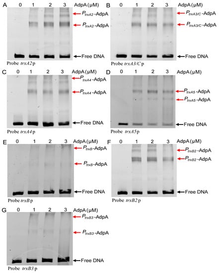 EMSA analysis His-tagged AdpA with the upstream promoter sequence probes of trx genes. 20 nM DNA probe was incubated with different amounts of His-tagged AdpA (0, 1, 2, 3 µM). Black arrow indicates the free DNA probe and red arrow indicates the AdpA-DNA complex. (A) A 299-bp DNA fragment containing the promoter and partial ORF sequence of trxA2 (sco5438) was synthesized as the probe. (B) A 311-bp DNA fragment containing the promoter and partial ORF sequence of trxA3/C (sco0885) was synthesized and used as the probe. (C) A 335-bp DNA fragment containing the promoter and partial ORF sequence of trxA4 (sco5419) was synthesized and used as the probe. (D) A 155-bp DNA fragment containing the promoter and partial ORF sequence of trxA5 (sco1084) was synthesized and used as the probe. (E) A 334-bp DNA fragment containing the promoter and partial ORF sequence of trxB (sco3890) was synthesized and used as the probe. The trxA and trxB were co-transcribed, trxB the first gene of the operon. (F) A 285-bp DNA fragment containing the promoter and partial ORF sequence of trxB2 (sco6834) was synthesized and used as the probe. The probe is promoter, (G) A 277-bp DNA fragment containing the promoter and partial ORF sequence of trxB3 (sco7298) was synthesized and used as the probe.