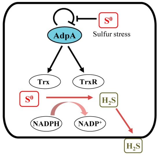 Living organisms are always exposed to different environmental stresses and have developed specialized strategy to cope with them. Several transcription factors dealing with RSS stress have been identified. They sense intra- and extracellular RSS and maintain the intracellular RSS homeostasis. For instance, CstR negatively regulates the transcription of H2S oxidation genes in Staphylococcus aureus [48]. SqrR is responsible for the regulation of 45% sulfide-responsive genes in Rhodobacter capsulatus [49]. FisR transcriptionally activates the expression of H2S oxidation genes in Cupriavidus pinatubonensis [50] and Acinetobacter baumannii [51]. In addition to these RSS specific sensors, a few global or multifunctional regulators also have RSS sensing functions, such as MgrA in Staphylococcus aureus [52], MexR in Pseudomonas aeruginosa [53], OxyR in Escherichia coli [54], and AdpA in S. coelicolor [33]. In a previous study, we demonstrated that RSS can release the self-inhibition of AdpA expression via modifying its Cys62 residue, thereby affecting secondary metabolites production and morphological differentiation [33]. In this study, we demonstrated that AdpA is also responsible for maintaining intracellular RSS homeostasis. Deleting adpA makes S. coelicolor more sensitive to exogenous RSS stresses, suggesting that AdpA can activate expression of trx genes, whose products (thioredoxins) can reduce RSS to H2S, which evaporates into the gas phaseto relieve the RSS stress (Figure 7). AdpA is global transcriptional regulator widely present in Streptomyces spp. AdpA binds to more than hundreds of operator regions, and these sequences are less conserved. The crystal structure of the AdpA-DBD-DNA complex and mutation analysis of AdpA-DBD revealed its unique DNA recognition mode, with only two arginine residues directly recognizing the conserved site, explaining its strict recognition of G and C at position 2 and 4, respectively, as well as its tolerance recognition to other positions in the consensus sequence [55]. Although AdpA has been reported to regulate many important physiological processes [56,57,58,59], this study is the first report of its role in the maintenance of intracellular RSS homeostasis. Our finding revealed a new role that AdpA may commonly play in Streptomyces spp.