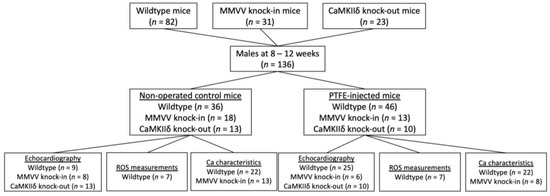 Study flowchart. C57BL/6 wildtype, MMVV knock-in, and CaMKIIδ knock-out mice were randomly assigned to either control or OSA induction by PTFE injection. After 8 weeks, echocardiography, ROS measurements, and epifluorescence microscopy were performed, whereby some experiments were performed in the same subject.