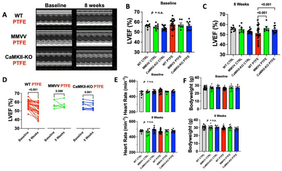 (A) Original M-mode echocardiographic traces of left ventricle. (B) Mean left ventricular ejection fraction per animal at baseline (CTRL groups: n = 9 WT, n = 8 MMVV, n = 13 CaMKII-KO; PTFE groups: n = 25 WT, n = 6 MMVV, n = 10 CaMKII-KO; ANOVA p = n.s.). (C) Mean left ventricular ejection fraction per animal after 8 weeks, # indicates p < 0.05 vs. WT PTFE at baseline. (D) Before–after presentation of PTFE group data from (B,C). (E) Heart rate during echocardiography from (B,C). (F) Animal body weight at baseline and after 8 weeks. Statistical comparisons are based on ANOVA, mixed-effects analysis with Holm–Sidak’s post hoc correction, and paired t-test, as appropriate.