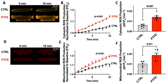In accordance, mitochondrial ROS production (measured as MitoSoxTM Red fluorescence intensity) increased over time in PTFE mice (p < 0.001, r2 = 0.656, n = 7) and was significantly greater compared with isolated myocytes from CTRL-treated mice (p < 0.001, n = 7, Figure 3D,E). The rate of increase in MitoSoxTM Red fluorescence intensity rose from (in ΔF/F0*min−1) 0.010 ± 0.002 in the control to 0.019 ± 0.002 in PTFE mice (p = 0.011, n = 7 each, Figure 3F).