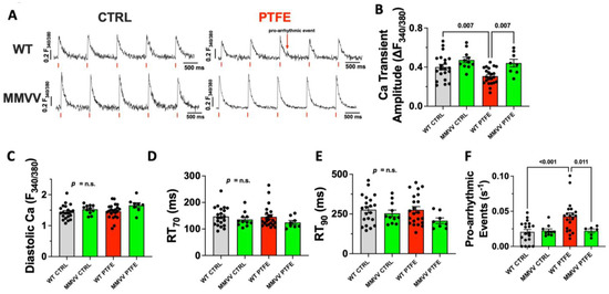 (A) Original Ca transients recorded in Fura-2 AM loaded isolated ventricular cardiomyocytes (1 Hz). The red arrow indicates a non-stimulated pro-arrhythmic event in a WT PTFE cell. (B) Mean Ca transient amplitude, diastolic Ca (C), relaxation time to 70% (D) and 90% of baseline (E) per animal (n = 21 WT CTRL, n = 11 MMVV CTRL, n = 22 WT PTFE, n = 8 MMVV PTFE). (F) Frequency of non-stimulated pro-arrhythmic events (as in (A), n = 19 WT CTRL, n = 10 MMVV CTRL, n = 20 WT PTFE, n = 6 MMVV PTFE). Statistical comparisons are based on ANOVA with Holm–Sidak’s post hoc correction.