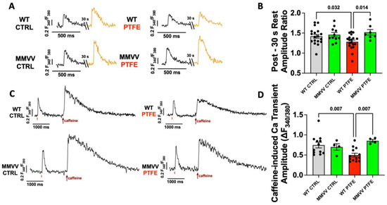 The depletion of SR Ca content due to diastolic SR Ca leak may explain the observed systolic contractile dysfunction of WT mice after PTFE treatment. Therefore, we measured the Ca transient evoked by rapid caffeine application in isolated ventricular myocytes as a measure of SR Ca content. Consistent with the increased SR Ca leak, the caffeine-induced Ca transient amplitude was significantly decreased to 0.500 ± 0.046 (n = 13) in WT mice after PTFE treatment (vs. 0.747 ± 0.071 in WT CTRL mice, p = 0.007, n = 12, Figure 5C,D). In contrast, PTFE treatment did not reduce caffeine-induced Ca transient amplitude in MMVV mice (0.853 ± 0.035, n = 4), which was significantly greater than in WT PTFE (p = 0.007).
