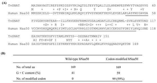 (A) Amino acid sequences of Thermoplasma volcanium serotonin N-acetyltransferase (TvSNAT.; NC_002689) and human (Homo sapiens) Naa50 (BAB14397). (B) Modification of hNaa50 codons. The nucleotide sequence of synthetic hNaa50 was codon-optimized with reference to the rice SNAT2 codon. The N-acetyltransferase domain is underlined. +, similar amino acids.