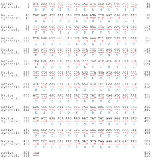 Nucleotide alignment of native (black; BAB14397) and synthetic (red) human Naa50. Identity is denoted by red dashes. Blue, amino acids.