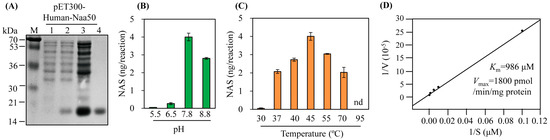 (A) Purification of N-terminal His × 6-tagged human Naa50. Serotonin N-acetyltransferase activity (conversion of serotonin into N-acetylserotonin [NAS]) as a function of (B) pH, (C) temperature, and (D) Km and Vmax values of human Naa50. E. coli BL21 (DE3) cells harboring the pET300-human Naa50 plasmid were induced with isopropyl β-D-thiogalactopyranoside (IPTG) for 5 h at 28 °C. M, molecular mass standards; lane 1, total proteins in 15 µL aliquots of bacterial culture without IPTG.; lane 2, total proteins in 15 µL aliquots of bacterial culture with IPTG.; lane 3, 20 µg soluble protein; lane 4, 5 µg protein purified by affinity chromatography. Protein samples were separated via 12% SDS-PAGE and stained with Coomassie blue. SNAT activity was measured based on N-acetylserotonin production in the presence of 0.5 mM serotonin at 45 °C and pH 7.8. Km and Vmax values were determined using Lineweaver-Burk plots. In vitro enzymatic products were measured via high-performance liquid chromatography (HPLC). Values are means ± SDs (n = 3).