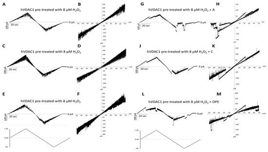 Analysis of the effect of tested samples on hVDAC1 voltage dependence following hydrogen peroxide treatment by triangular voltage ramps. Sample A (panels (G,H)), sample C (panels (J,K)) and sample OPE (panels (L,M)) were added to both sides of a DiphPC bilayer containing hVDAC1 pre-treated with 8 µM H2O2 (panels (A–F)) at a final concentration of 1:100 (v/v). Current measurements were performed in symmetrical 1 M KCl upon application of a triangular voltage ramp of ±50 mV. The corresponding I–V plots were obtained by plotting the current as a function of clamp voltage.