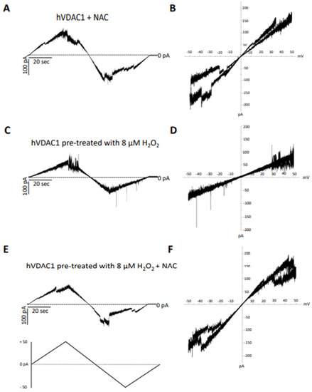 Analysis of the effect of N-acetyl cysteine on hVDAC1 voltage dependence following hydrogen peroxide treatment by triangular voltage ramps. NAC was added at a final concentration of 8 µM to membrane-embedded hVDAC1pA pretreated (panels (C–F)) or not (panels (A,B)) with 8 µM H2O2 (panels (C,D)). Current measurements were performed on symmetrical hVDAC1 pre-treated with 8 µM H2O2 1 M KCl upon application of a triangular voltage ramp of ±50 mV. The corresponding I–V plots were obtained by plotting the current as a function of clamp voltage.