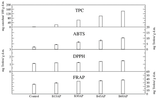The content of total polyphenols (TPC) in gluten-free cookies ranged from 20.58 to 143.16 mg of catechin/100 g d.m. in comparison to the control, which contained 3.21 mg of catechin/100 g d.m. Thus, the apple pomace used guaranteed an up to 44-fold increase in these bioactive compounds in gluten-free cookies with a share of 60% pomace relative to the control. Even the lowest proportion of apple pomace caused a 6-fold increase in polyphenols in gluten-free cookies (Figure 2).