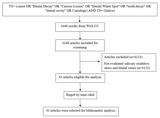 A comprehensive search was performed by two independent examiners in the Web of Science Core Collection (WoS-CC) in November 2022, using the following search key: TS = (caries OR “Dental Decay” OR “Carious Lesion” OR “Dental White Spot” OR “tooth decay” OR “dental cavity” OR Cariology) AND TS = (Saliva).