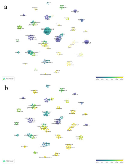 Co-authorship overlay visualization of the 43 articles showing the collaboration of the authors of the selected articles about the relation of dental caries and salivary oxidative stress. The total of 164 author form 30 clusters. The overlay visualization, the lines connecting authors the size of node denote number of articles (a) and number of citations (b), respectively.