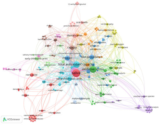 A total of 180 keywords were identified and saliva (n = 27; 250 citations) is the most used and most cited keyword, followed by dental caries (n = 24; 201 citations), oxidative stress (n = 19; 183 citations), and total antioxidant capacity (n = 18; 154 citations). The distribution of the keywords is shown in Figure 4. The size of the node indicates the frequency of the keyword, the larger the node, the higher the frequency. The thickness of the edge is related to the closeness of the interactions between the two nodes. Note that the color of the node indicates the cluster to which the keyword belongs.