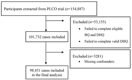 In total, there were 154,887 participants extracted from the PLCO trial. After excluding 53,155 individuals who failed to complete valid BQ and DHQ, 101,732 subjects remained in the study. Eligible participants who completed a valid BQ had no history of lung cancer prior to the trial but had time at risk for developing their first cancer. A valid DHQ was defined as the completion of the questionnaire with a completion date before date of death, missing no more than 7 frequency responses, and not having extreme energy intake (top and bottom 1% of each sex group). We further excluded 3281 participants due to the missing of important covariates (study arm, sex, education, body mass index, marital status, family history of lung cancer or any other cancer, smoking status, pack-years of cigarettes, and alcohol drinking status). Finally, there were 98,451 cases included in the analytical dataset. A flow diagram is presented in Figure 1.