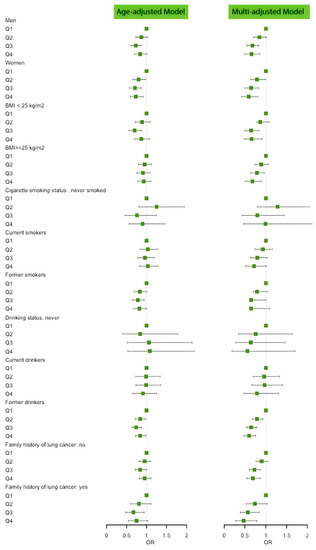 Figure 2 and Table A1 show the results of the subgroup analyses in different populations. Pronounced protective linear trends were also observed among male, female, normal weight and overweight individuals, current cigarette smokers, current alcohol drinkers, and individuals with and without a family history of lung cancer. However, no effects were noted among individuals who have never smoked or formerly smoked and individuals who have never drunk or formerly drank.