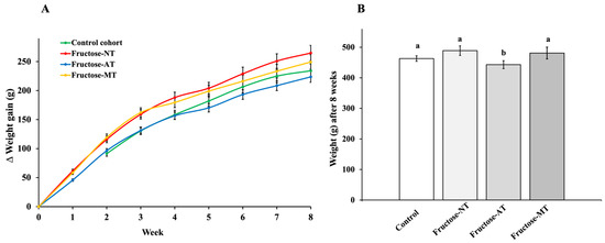 Weight of animals during the experimentation. (A) Time course showing the weight gain of animals during the 8 weeks. (B) Bar graph showing the weight of animals at the end of the experiment. Different letters show a significant difference at (p < 0.05).