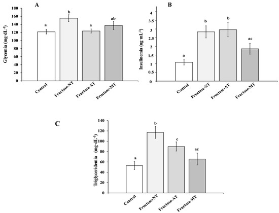 Biochemical parameters evaluated at the end of the experiment (week 8). (A) Blood glucose (B) Insulinemia (C) Triglycerides levels. Different letters show significant differences at (p < 0.05).