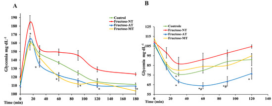 Tests of glucose and insulin tolerance at the end of experiment. (A) Oral glucose tolerance. (B) Intraperitoneal insulin tolerance. *: significant differences compared to Fructose-NT. #: significant differences compared to control (p < 0.05).