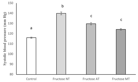 Systolic arterial blood pressure at the end of the experiment (week 8). Different letters show significant differences at (p < 0.05).