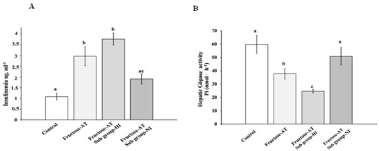 Specific analysis of the two subgroups of the Asteraceae infused drink. (A) Insulinemia; (B) Hepatic glucose-6-phosphatase activities. Subgroup-HI (high insulinemia) (n = 5); subgroup-NI (normal insulinemia) (n = 3). Different letters (a, b and c) indicate significantly differences from each (p < 0.05).