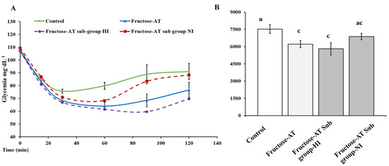 Specific analysis of the two subgroups of Asteraceae infused drink. (A) Intraperitoneal insulin tolerance test (B) Subgroup-HI (high insulinemia) (n = 5); subgroup-NI (normal insulinemia) (n = 3). Different letters (a and c) indicate significantly differences from each (p < 0.05).