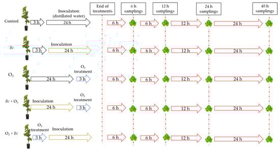 Visual summary of the whole experimental steps (inoculation with Botrytis cinerea (Bc), ozone (O3) treatment and their combination, and sampling timing)). Abbreviations: Bc−/O3−, uninoculated and maintained in filtered air; Bc+/O3−, inoculated with Bc and maintained in filtered air; Bc−/O3+, uninoculated and treated with O3 (100 ppb, 3 h); Bc+ + O3+, inoculated with Bc and then subjected to O3 treatment; O3+ + Bc+, treated with O3 and then inoculated with Bc.