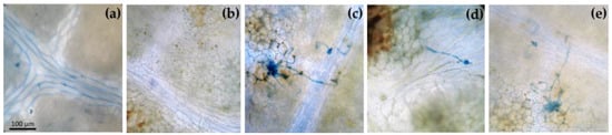 Leaves of Vitis vinifera var. Sangiovese coloured with lactophenol-cotton blue and observed in an optical after 48 h from the end of each treatment. From left to right: Leaves from plants (a) uninoculated and maintained in filtered air (Bc−/O3−), (b) uninoculated with Botrytis cinerea (Bc) and treated with ozone (O3, 100 ppb, 3 h; Bc−/O3+), (c) inoculated with B. cinerea and maintained in filtered air (Bc+/O3−), (d) inoculated with B. cinerea and then subjected to O3 treatment (Bc+ + O3+), and (e) treated with O3 and then inoculated with B. cinerea (O3+ + Bc +).