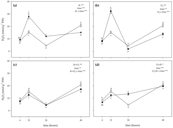 Time course of hydrogen peroxide (H2O2) content in leaves of Vitis vinifera var. Sangiovese uninoculated and maintained in filtered air (Bc−/O3−; empty circle) compared to samples (a) inoculated with Botrytis cinerea (Bc) and maintained in filtered air (Bc+/O3−; filled triangle), (b) uninoculated with B. cinerea and treated with ozone (O3, 100 ppb, 3 h; Bc−/O3+; filled square), (c) inoculated with B. cinerea and then subjected to O3 treatment (Bc+ + O3+; filled diamond), and (d) treated with O3 and then inoculated with B. cinerea (O3+ + Bc+; filled circle). Data are shown as mean ± standard deviation. The measurements are carried out at 6, 12, 24 and 48 h from the end of the treatment. In each graph, the results of two-way ANOVA are reported, asterisks showing the significance of factors /interaction for: *** p ≤ 0.001; ** p ≤ 0.01; * p ≤ 0.05. According to Tukey’s HSD post hoc test, different letters indicate significant differences (p ≤ 0.05). Abbreviation: FW, fresh weight.