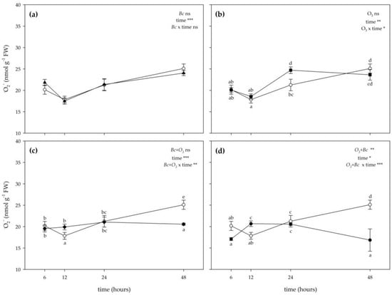 Time course of superoxide radical (●O2−) generating rate in leaves of Vitis vinifera var. Sangiovese uninoculated and maintained in filtered air (Bc−/O3−; empty circle) compared to samples (a) inoculated with Botrytis cinerea (Bc) and maintained in filtered air (Bc+/O3−; filled triangle), (b) uninoculated with B. cinerea and treated with ozone (O3, 100 ppb, 3 h; Bc−/O3+; filled square), (c) inoculated with B. cinerea and then subjected to O3 treatment (Bc+ + O3+; filled diamond), and (d) treated with O3 and then inoculated with B. cinerea (O3+ + Bc+; filled circle). Data are shown as mean ± standard deviation. The measurements are carried out at 6, 12, 24 and 48 h from the end of the treatment. In each graph, results of two-way ANOVA are reported, asterisks showing significance of factors/interaction for: *** p ≤ 0.001; ** p ≤ 0.01; * p ≤ 0.05; ns p > 0.05. According to Tukey’s HSD post hoc test, different letters indicate significant differences (p ≤ 0.05). Abbreviation: FW, fresh weight.