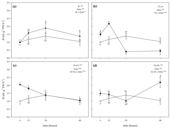 Time course of ethylene (Et) emission in leaves of Vitis vinifera var. Sangiovese uninoculated and maintained in filtered air (Bc−/O3−; empty circle) compared to (a) inoculated with Botrytis cinerea (Bc) and maintained in filtered air (Bc+/O3−; filled triangle), (b) uninoculated with B. cinerea and treated with ozone (O3, 100 ppb, 3 h; Bc−/O3+; filled square), (c) inoculated with B. cinerea and then subjected to O3 treatment (Bc+ + O3+; filled diamond), and (d) treated with O3 and then inoculated with B. cinerea (O3+ + Bc+; filled circle). Data are shown as mean ± standard deviation. The measurements are carried out at 6, 12, 24 and 48 h from the end of the treatment. In each graph, results of the two-way ANOVA are reported, asterisks showing significance of factors/interaction for: *** p ≤ 0.001; * p ≤ 0.05; ns p > 0.05. According to Tukey’s HSD post hoc test, different letters indicate significant differences (p ≤ 0.05). Abbreviation: FW, fresh weight.