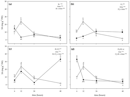 Time course of salicylic acid (SA) content in leaves of Vitis vinifera var. Sangiovese uninoculated and maintained in filtered air (Bc−/O3−; empty circle) compared to (a) inoculated with Botrytis cinerea (Bc) and maintained in filtered air (Bc+/O3−; filled triangle), (b) uninoculated with B. cinerea and treated with ozone (O3, 100 ppb, 3 h; Bc−/O3+; filled square), (c) inoculated with B. cinerea and then subjected to O3 treatment (Bc+ + O3+; filled diamond), and (d) treated with O3 and then inoculated with B. cinerea (O3+ + Bc+; filled circle). Data are shown as mean ± standard deviation. The measurements are carried out at 6, 12, 24 and 48 h from the end of the treatment. In each graph, the results of two-way ANOVA are reported, asterisks showing significance of factors/interaction for: *** p ≤ 0.001; ns p > 0.05. According to Tukey’s HSD post hoc test, different letters indicate significant differences (p ≤ 0.05). Abbreviation: FW, fresh weight.
