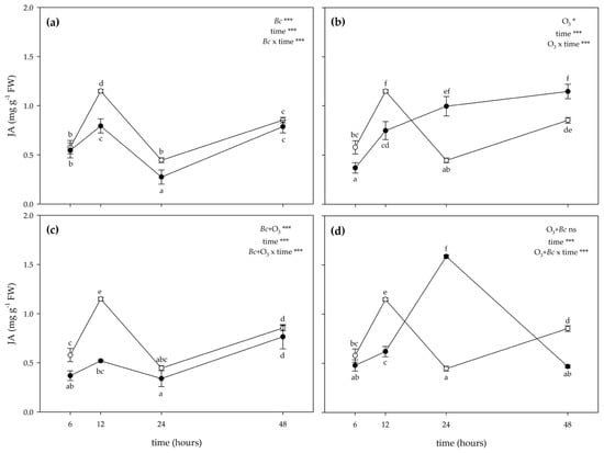 Time course of jasmonic acid (JA) content in leaves of Vitis vinifera var. Sangiovese uninoculated and maintained in filtered air (Bc−/O3−; empty circle) compared to (a) inoculated with Botrytis cinerea (Bc) and maintained in filtered air (Bc+/O3−; filled triangle), (b) uninoculated with B. cinerea and treated with ozone (O3, 100 ppb, 3 h; Bc−/O3+; filled square), (c) inoculated with B. cinerea and then subjected to O3 treatment (Bc+ + O3+; filled diamond), and (d) treated with O3 and then inoculated with B. cinerea (O3+ + Bc+; filled circle). Data are shown as mean ± standard deviation. The measurements are carried out at 6, 12, 24 and 48 h from the end of the treatment. In each graph, results of two-way ANOVA are reported, asterisks showing significance of factors/interaction for: *** p ≤ 0.001; * p ≤ 0.05; ns p > 0.05. According to Tukey’s HSD post hoc test, different letters indicate significant differences (p ≤ 0.05). Abbreviation: FW, fresh weight.
