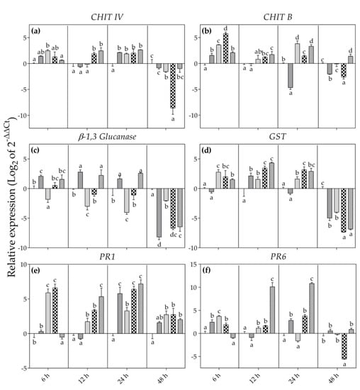 Relative expression level of CHIT IV (a), CHIT B (b), β-1,3 Glucanase (c), GST (d), PR1 (e) and PR6 (f) analysed by RT-qPCR in leaves of Vitis vinifera var. Sangiovese uninoculated and maintained in filtered air (Bc−/O3−; black) and (a) inoculated with Botrytis cinerea (Bc) and maintained in filtered air (Bc+/O3−; dark grey), (b) uninoculated with B. cinerea and treated with ozone (O3, 100 ppb, 3 h; Bc−/O3+; grey), (c) inoculated with B. cinerea and then subjected to O3 treatment (Bc+ + O3+; dark check pattern), and (d) treated with O3 and then inoculated with B. cinerea (O3+ + Bc+; grey check pattern). The measurements are carried out at 6, 12, 24 and 48 h from the end of the treatment. The average value of the three biological replicates is reported with bars representing standard deviation. In each sampling time, different letters indicate differences among sample values (p < 0.05) based on one-way ANOVA.