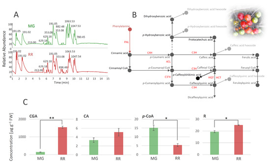 UHPLC/LTQ Orbitrap MSn chromatograms of methanol extracts of mature green (MG) and ripe red (RR) bittersweet fruits (A). Based on the qualitative profiles of polyphenolics, a putative biosynthetic route of major phenolic acids in bittersweet fruits is proposed (B), which is mainly represented by chlorogenic acid (caffeoylquinic acid), caffeic acid, and p-coumaric acid. UHPLC/(−)HESI-MS2 quantitative analysis of major phenolic acids in MG and RR fruits (C): Asterisks (*) denote significant differences between MG and RR fruits according to the t-test, p values: * p ≤ 0.05; ** p ≤ 0.01. Abbreviations: PAL—phenylalanine ammonia-lyase; C4H—cinnamate hydroxylase; 4CL—4-hydroxycinnamoyl-CoA ligase; C3H—p-coumaroyl ester 3-hydroxilase; C3′H—p-coumaroylester 3′-hydroxylases; HQT—hydroxycinnamoyl CoA quinate transferase; HCT—hydroxycinnamoyl-CoA shikimate/quinate hydroxycinnamoil transferase; CGA—chlorogenic acid (caffeoylquinic acid); CA—caffeic acid; p-CoA—p-coumaric acid; R—rutin.