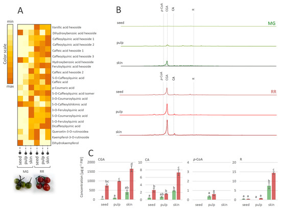 (A) Heat-map presenting relative amounts of polyphenolics in different tissues of mature green (MG) and ripe red (RR) bittersweet fruits, as analyzed by UHPLC/LTQ Orbitrap MSn. Color scale indicates values representing peak areas of compounds, distributed between min and max values among tissues, for each compound individually. (B) UHPLC/DAD chromatograms of MeOH extracts of seed, pulp, and skin of MG and RR fruits are presented, acquired at λ = 260 nm. (C) UHPLC/(−)HESI-MS2 quantitative analysis of major phenolic acids in MG and RR fruits. Letters above the bars denote significant differences according to Tukey’s pairwise test at p ≤ 0.05. Abbreviations: CGA—chlorogenic acid (caffeoylquinic acid); CA—caffeic acid; p-CoA—p-coumaric acid; R-rutin.