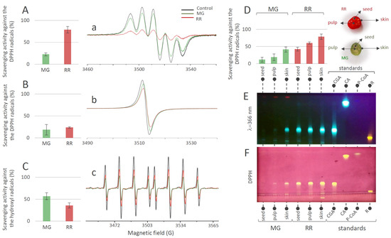DPPH scavenging activity (%) obtained 2 min after the addition of DPPH into the bittersweet fruits system containing (A) MeOH extracts or (B) water extracts of MG (green bars) and RR (red bars), and representative EPR spectra of (a) DPPH radical in MeOH (black line), and in reaction with the MG (green line) and RR (red line) fruit MeOH extracts system, and (b) DPPH radical in H2O (black line), and in reaction with the MG (green line) and RR (red line) fruit water extracts system. (C) •OH scavenging activity (%) obtained 2 min after the •OH generation in the Fenton reaction system containing H2O extracts of MG (green) and RR (red) bittersweet fruits, and (c) representative EPR spectra of DEPMPO/OH spin adducts obtained in the Fenton reaction system without (black line) and in reaction with the MG (green line) and RR (red line) fruit water extracts. (D) DPPH scavenging activity (%) recorded 2 min after the addition of DPPH into the system containing MeOH extracts of the skin, pulp, and seeds of MG (green) and RR (red) bittersweet fruits. Values are the means of three biological replicates, and error bars represent signal-to-noise ratio. (E) HPTLC of MeOH extracts of seed, pulp, and skin of MG and RR bittersweet berries at 366 nm, and (F) corresponding HPTLCDPPH assay.
