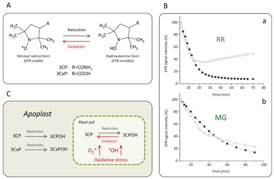(A) Reversible one-electron reduction–oxidation showing the interconversion between the nitroxide 3CP and 3CxP spin probes (EPR visible) and corresponding reduced hydroxylamine forms 3CPOH and 3CxPOH (EPR invisible). (B) Kinetics of change of the EPR signal intensity of spin probes 3CP (white circles) and 3CxP (black circles) in strips of RR (a) and MG (b) bittersweet fruits adopting the X-band 1D gradient EPRI technique. (C) Proposed mechanism of the 3CP and 3CxP reduction–oxidation as influenced by the oxidative stress in bittersweet fruits and their localization in the cellular compartmentation.