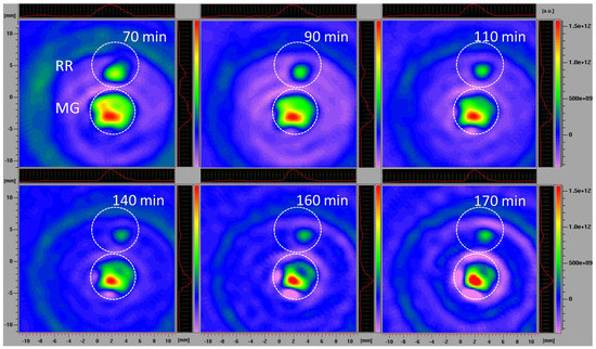 To visualize the capacity of MG and RR bittersweet fruits to perform the extra/intracellular reduction of the pyrrolidine spin probe, membrane-permeable (3CP) spin probes were used. For this purpose, 1 mm thick round slice samples of the same mass (15 mg), excised from MG and RR fruits, were placed onto a quartz tissue cell, one above the other, and recorded using X-band 2D imaging EPR experiment (Figure 1B). An RR fruit slice was soaked with 20 μL of 15 mM 3CP, an MG bittersweet tissue sample was soaked with 20 μL of 2 mM 3CP, and EPR signals were recorded using an imaging experiment in the ZY-plane with the following parameters: microwave power: 10 mW; microwave frequency: 9.8 GHz; modulation frequency: 100 kHz; modulation amplitude: 2 G; magnetic field gradient: 20 G cm−1. The 2D images were recorded at intervals of 10, 20, 30, 55, 95, and 115 min. To obtain a high-quality 2D EPR image during the prolonged-time period, a higher concentration of 3CP had to be used for the RR fruit samples since they showed a considerably higher spin probe reduction capacity.