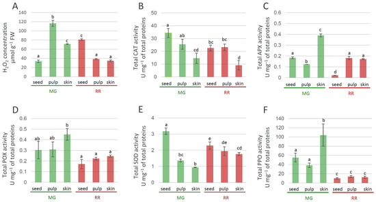 Tissue-specific concentration of H2O2 in MG (green bars) and RR (red bars) bittersweet fruits (A), as well as activities of antioxidant enzymes: CAT (B), APX (C), POX (D), SOD (E), PPO (F). Values are presented as means of three biological replicates and standard errors. Samples denoted by the same letter are not significantly different (p ≤ 0.05) according to Fisher’s LSD test. Abbreviations: CAT—catalase; APX—ascorbate peroxidase; POX—peroxidase; SOD—superoxide dismutase; PPO—polyphenoloxidase.