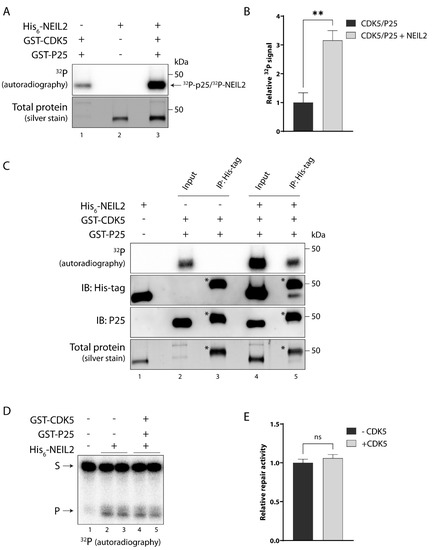 3.5. NEIL2 Is Phosphorylated by CDK5 In Vitro, but It Does Not Affect NEIL2 Activity