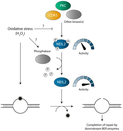 - Prakash, A.; Cao, V.B.; Doublié, S. Phosphorylation Sites Identified in the NEIL1 DNA Glycosylase Are Potential Targets for the JNK1 Kinase. PLoS ONE 2016, 11, e0157860. [Google Scholar] [CrossRef]