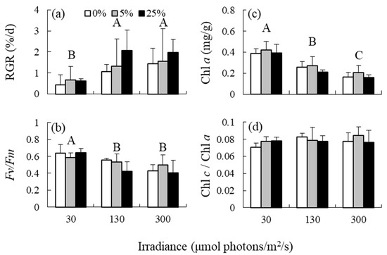 (a) Relative growth rates (RGRs), (b) photosystem II efficiency (Fv/Fm), (c) chlorophyll (Chl) a content, and (d) Chl c2/Chl a ratios of the brown alga Sargassum fusiforme acclimated to three irradiance levels (30, 130, and 300 μmol photons m−2 s−1) and three nutrient levels (0, 5, and 25% Provasoli’s enriched seawater, PESI). Values are expressed as means ± standard deviation. Different large letters indicate statistical significances (p < 0.05) among the different treatments.