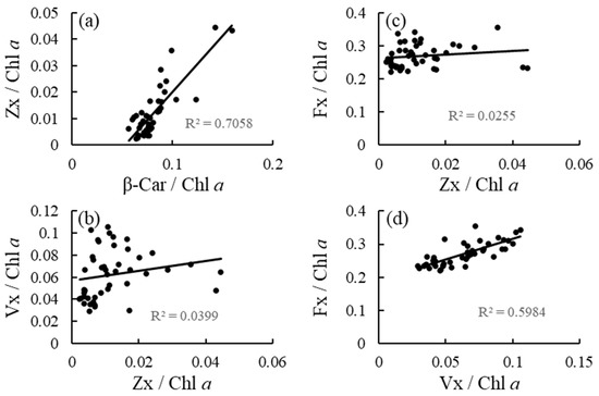(a) Correlations between β-Car/Chl a and Zx/Chl a ratios, (b) between Zx/Chl a and Vx/Chl a ratios, (c) between Zx/Chl a and Fx/Chl a ratios, and (d) between Vx/Chl a and Fx/Chl a ratios of the brown alga Sargassum fusiforme acclimated to three irradiance levels (30, 130, and 300 μmol photons m−2 s−1) and three nutrient levels (0, 5, and 25% Provasoli’s enriched seawater, PESI).