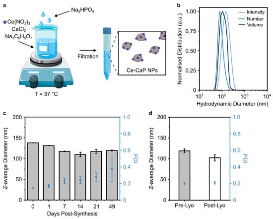 Synthesis and the physico-chemical characterization of Ce-CaP NPs. (a) Schematic of the synthesis of Ce-CaP NPs; the schematic was partly generated using Servier Medical Art, provided by Servier, licensed under a Creative Commons Attribution 3.0 unported license. (b) Normalized intensity (light blue), number (blue), and volume (dark blue) distributions of the Ce-CaP NPs hydrodynamic diameter as measured by DLS. Z-average diameter and PDI of Ce-CaP NPs at 4 °C over 49 days (c) and pre- and post-lyophilization (d). Data are shown as mean ± standard deviation of N ≥ 2 independent batches.