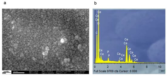Structural and compositional characterization of Ce-CaP NPs. Representative SEM micrograph (a) and EDS spectrum (b) of Ce-CaP NPs; scale bar: 200 nm.