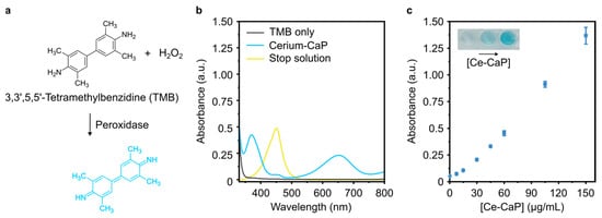 Peroxidase-like activity of Ce-CaP NPs. (a) Schematic of the redox reaction between TMB, H2O2, and peroxidase. (b) Absorption spectra of samples containing the TMB substrate solution only (grey trace), TMB substrate solution and Ce-CaP NPs at a concentration of 56 μg/mL (blue trace), or TMB substrate solution, Ce-CaP NPs at a concentration of 56 μg/mL, and 0.16 M sulfuric acid (stop solution, yellow trace). (c) Absorbance of the reaction product measured at 451 nm with varying concentrations of the Ce-CaP NPs. Ce-CaP NPs were added to the TMB substrate solution and the reaction was stopped after 1 min with the addition of a stop solution. Data points are represented as mean ± s.d. (N = 3 independent batches, n = 3 technical replicates). The inset shows the color change due to TMB oxidation with increasing concentration of Ce-CaP NPs.