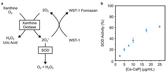 We next probed the SOD-like activity of Ce-CaP NPs with a colorimetric assay based on the oxidation of a water-soluble tetrazolium salt, which is converted into a formazan dye with an absorption peak at 450 nm by superoxide anions generated by xanthine oxidase. In the presence of SOD, the superoxide anion is converted into hydrogen peroxide and oxygen, leading to a decrease in the concentration of the dye (Figure 4a). The SOD activity can be regarded as inhibition activity since higher concentrations of SOD lead to a more pronounced decrease in the measured absorbance [36]. The Ce-CaP NPs exhibited SOD-like activity and the addition of increasing concentrations of Ce-CaP NPs led to an increase in the SOD-like activity (Figure 4b), similar to what has been previously reported for cerium oxide nanoparticles [36,37,38].