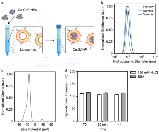 Coating metal oxide nanoparticles with biomaterials has been proposed as a strategy to improve nanoparticle serum stability against aggregation and cellular uptake, as well as to provide a handle for surface functionalization with, e.g., targeting moieties [39]. Cerium-based nanoparticles have been coated with various materials such as dextran/poly (acrylic) acid [40,41], heparin [42], PEG-based copolymers [38], or cell-membrane derived lipids [43]. In this work, we assessed the possibility to form SANP by mixing Ce-CaP NPs with DOTAP:CerPEG liposomes to obtain lipid-coated Ce-CaP NPs (Figure 5a). The liposomes exhibited a z-average diameter of 135 ± 3.34 nm, a PDI of 0.037 ± 0.02, and a zeta potential of + 45.09 ± 1.72 mV. Mixing the liposomes with the Ce-CaP NPs yielded SANP with a z-average diameter of 108.93 ± 1.62 nm and a PDI of 0.11 ± 0.06 (Figure 5b); the Ce-SANP were shown to be negatively charged, with a zeta potential of −30.98 ± 1.34 mV (Figure 5c). A reduction in the z-average diameter was observed for the Ce-SANP compared to the liposome and the Ce-CaP NPs, which may suggest a structural reorganization of these components following mixing to obtain Ce-SANP, as observed in previous studies [44].