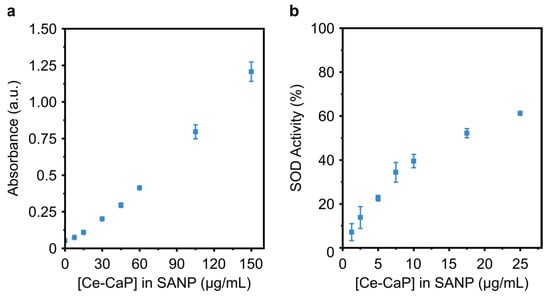 In order to understand the effect of the lipid coating on the enzyme-like properties of Ce-CaP NPs, we carried out the peroxidase and the SOD activity assays on the Ce-SANP by using an equivalent concentration of Ce-CaP NPs. The Ce-SANP retained their peroxidase-like activity (Figure 6a), which was a function of the concentration of Ce-CaP NPs in the SANP formulation. Ce-SANP also exhibited similar SOD-like activity to bare Ce-CaP NPs with a concentration-dependent behavior. Overall, the lipid coating did not impair the enzyme-like properties of the Ce-CaP NPs, as previously observed for cerium oxide nanoparticles encapsulated in nanostructured lipid carriers [46] or adsorbed on the surface of mesoporous silica nanoparticles which were subsequently coated with a lipid shell [47].