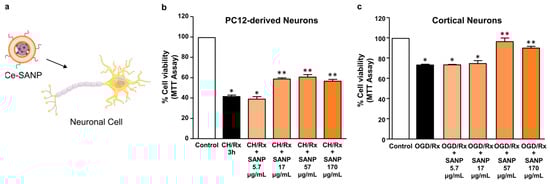 Effects of Ce-SANP on mitochondrial activity in primary cortical neurons exposed to OGD followed by reoxygenation and differentiated PC12 cells exposed to chemical hypoxia. Ce-SANPs were added to neuronal cells under oxidative stress conditions (a) at various concentrations (the schematic was partly generated using Servier Medical Art, provided by Servier, licensed under a Creative Commons Attribution 3.0 unported license). Dose-dependent effects of Ce-SANP on cell viability, measured as mitochondrial activity, in (b) PC12 cells differentiated with NGF and exposed to chemical hypoxia followed by reoxygenation (CH/Rx) and (c) primary cortical neurons exposed to OGD followed by reoxygenation (OGD/Rx). In both cases, Ce-SANPs were added only during the reoxygenation phase. The white bars represent cells treated with vehicle while the black bars represent the cells under oxidative stress conditions without the addition of Ce-SANP. * p < 0.05 vs. control, ** p < 0.05 vs. CH/Rx or OGD/Rx and vs. CH/Rx + SANP at the lowest concentration (5.7 µg/mL or OGD/Rx + SANP at the lowest concentration (5.7 µg/mL).